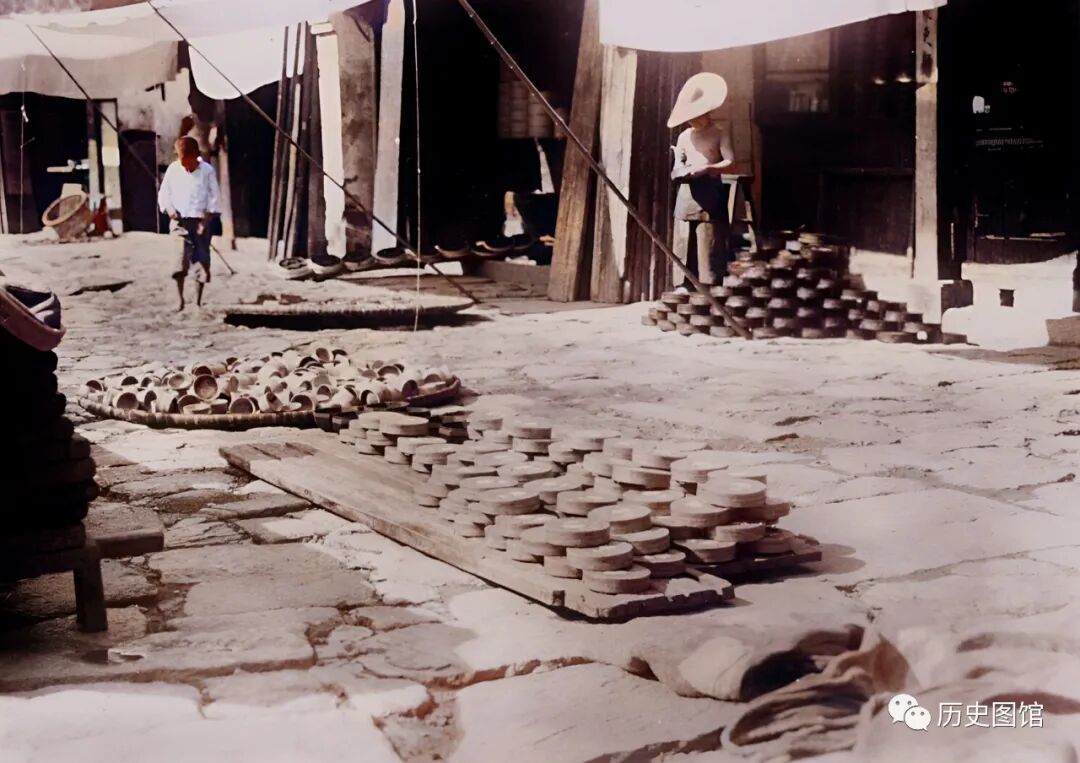 1929年,安徽九华山上的一条小街道。路面用石块铺就,路两侧是一些店铺,门口撑着遮阳棚。店家将商品直接摆放到了门口,方便顾客挑选。你知道这种圆饼形的东西是什么吗?