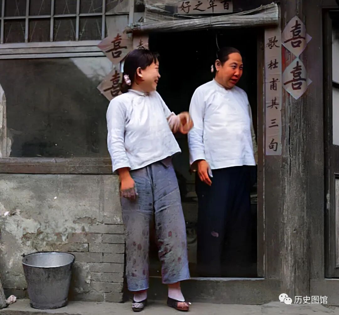 安阳城内,一名年轻小媳妇站在门口,逗自己的婆婆开心。门框上还贴褪色的大红喜字,可见这名小媳妇新婚不久,婆媳两人的关系却相处得很融洽。