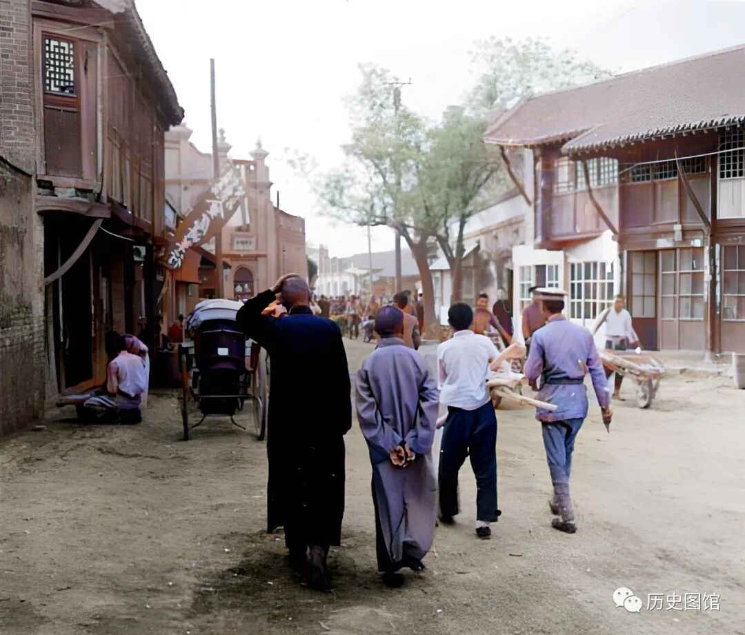 民国时期,安阳街头景象。街道两侧都是古色古香的建筑,还能看到黄包车、独轮车的身影。