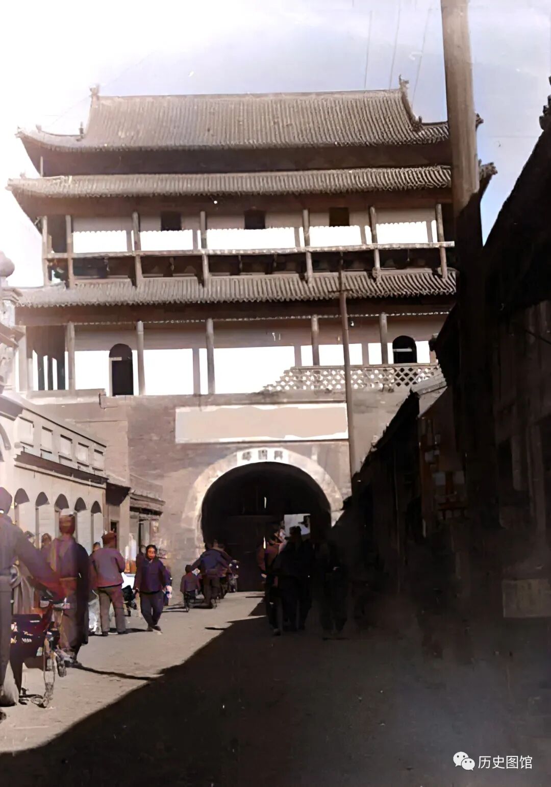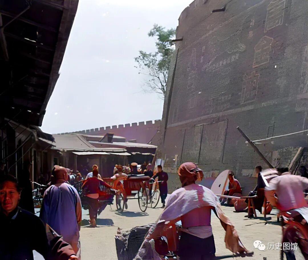 在这张照片里,能看到高大的安阳城墙和城墙上的垛口。城墙下,有人在摆地摊,黄包车和独轮车以及自行车不时从街上走过。