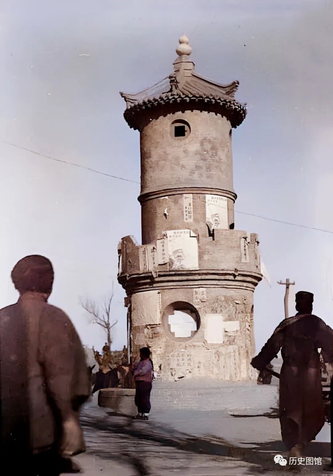 笔者从另一张照片上看到,这座砖塔后面就是安阳城的的一座角楼。到了日伪时期,这座圆形砖塔,变身为一座警亭,每天都有警察在这里站岗执勤。