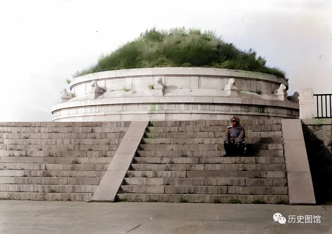 1939年,位于安阳的袁世凯陵园内,巨大的陵墓顶部,长满了碧绿的杂草。一名日本士兵坐在袁世凯墓冢前的台阶上。袁世凯墓,又称袁林,是安阳洹水北岸的一处奇特景观。
