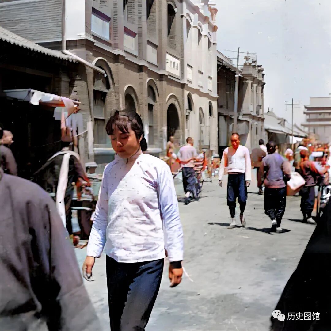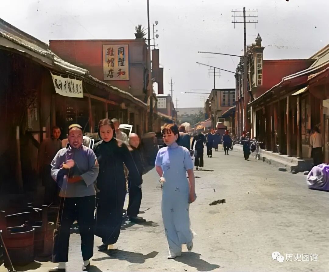 这也是当时安阳城内一条繁华的街道。街道笔直,一眼望不到尽头。街道两侧都是古色古香的建筑。远处楼房的墙壁上,写着鞋帽店的标语。一名身穿旗袍的女子从街上走过。