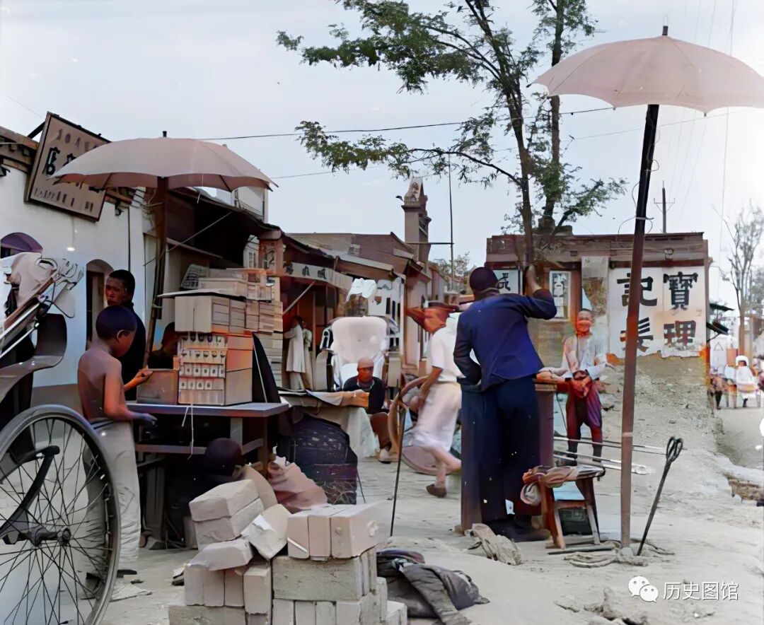 民国时期,安阳街头路边的土台子上,一些小贩在摆摊做生意。有烤红薯的,有卖小饰品的,摊位边都撑着一把遮阳伞。还有一些沿街店铺,比如宝记理发店等。几个孩子正在摊位前玩耍,充满了生活气息。