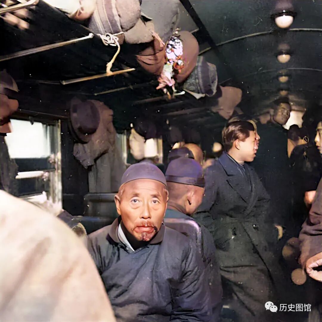 民国时期,从安阳出发的火车上,挤满了乘客,有的人没有座位,就站在过道上,行李架上也塞满了行李。一位老大爷望着摄影师的镜头,感觉很好奇。火车已成为当时大众出行首选的交通工具。