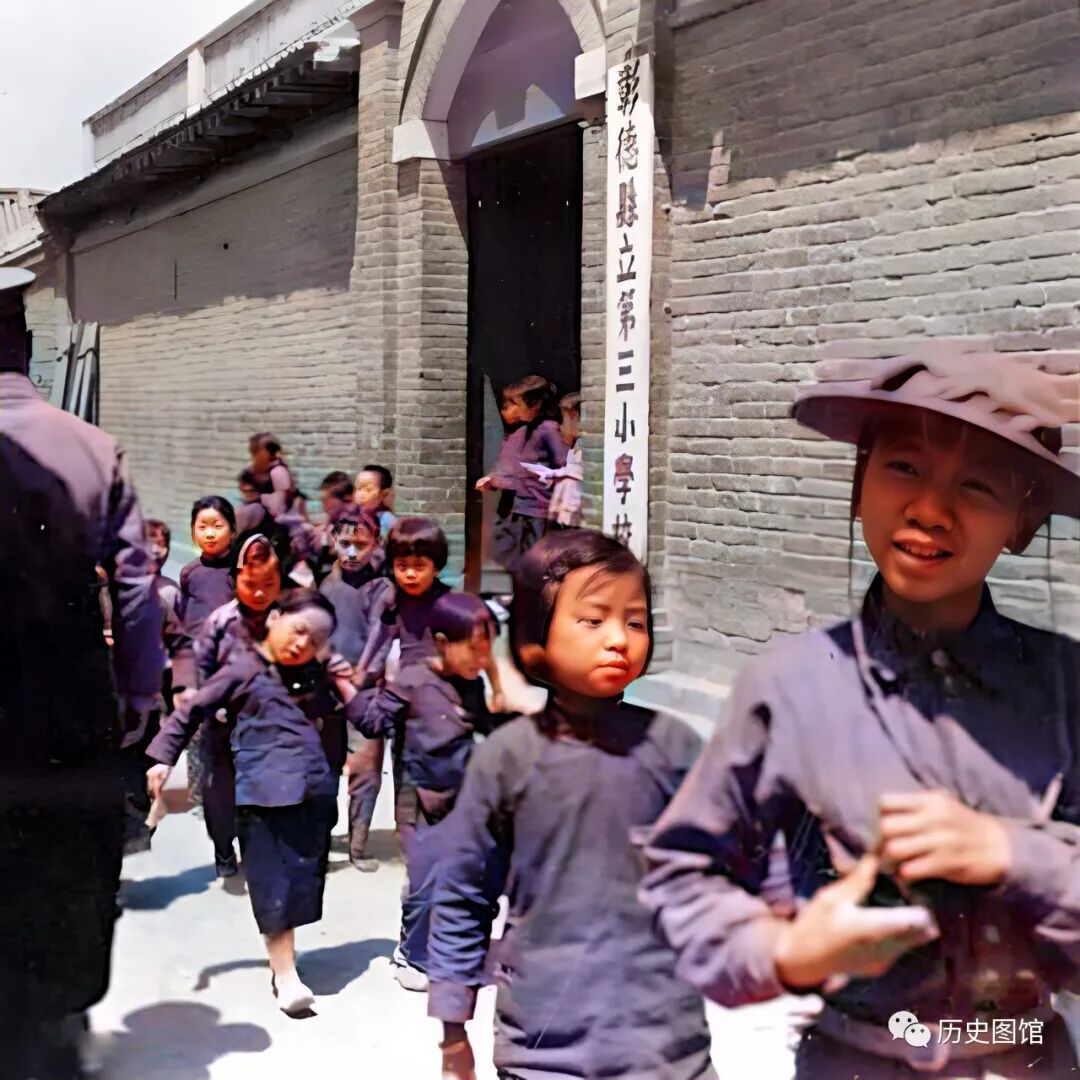 民国时期,安阳县立第三小学校放学时的情景。学校门口的牌子上写着“彰德县立第三小学校”。