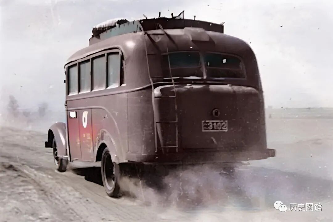 民国时期,一辆汽车正在道路上飞驰,后面扬起一阵尘土。车尾悬挂着黑色车牌,上面有3102的车牌号。看上去,这应该不是一辆民用车辆。