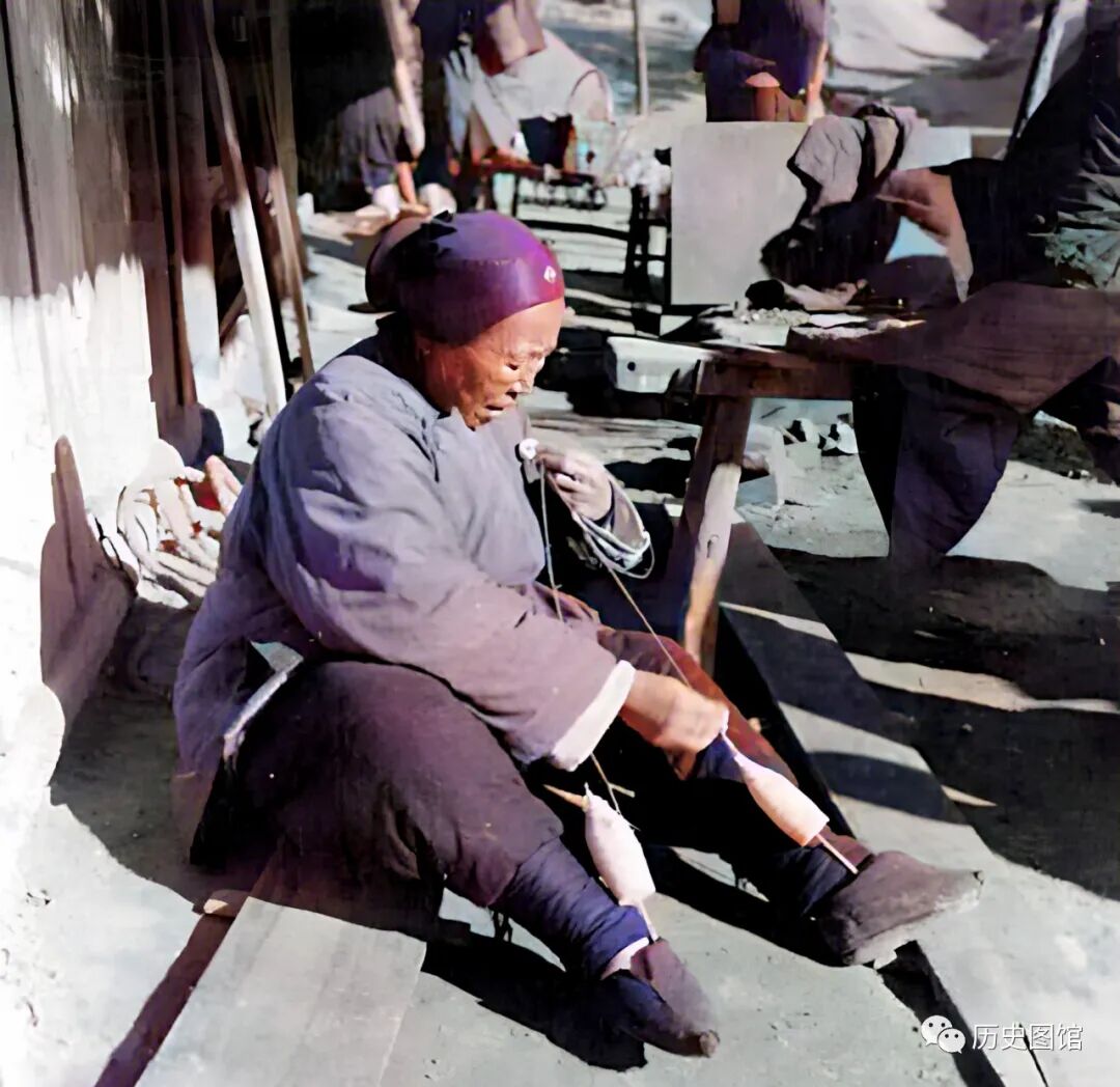 在一家木器店门口,一位小脚老太太席地而坐,正在纺线。两只脚上各插着一个筷子做的纺锤,她要把两股线合成一根线。老人看上去有70岁,眼不花、耳不聋,非常的慈祥和蔼。