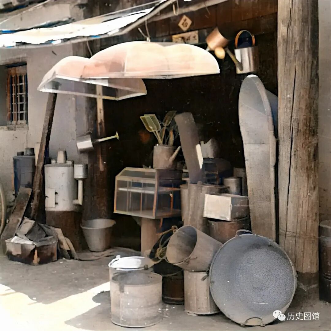 这是安阳街边的一家五金店铺。门口摆着铁锅、铁桶、水壶、煤炉、玻璃做的箱子等,门口上方还悬挂着铁丝网做的罩子。隐约能看到,老板正在店里面忙碌着。