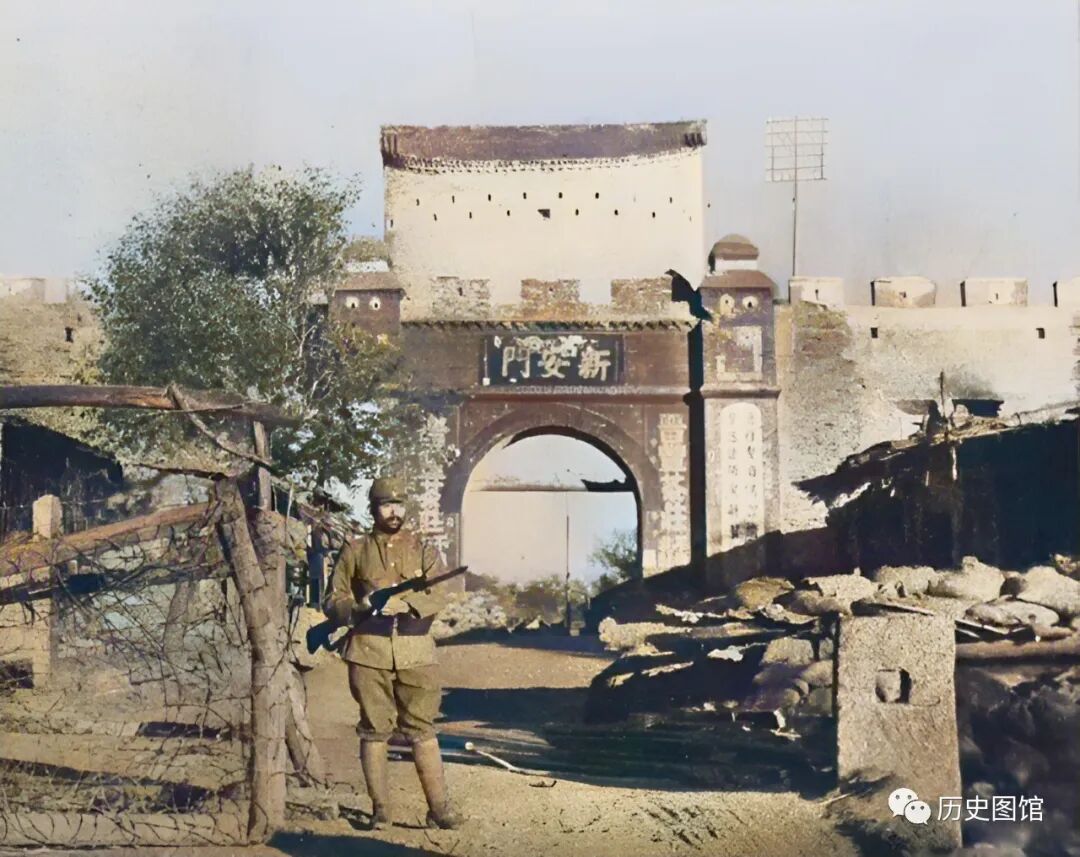 民国时期,在安阳的新安们门前,有一名日军士兵把守。新安门,也叫小西门。新安门见证了安阳抗日的经过。城门上建筑上的一个个小洞,是机枪的射击孔。