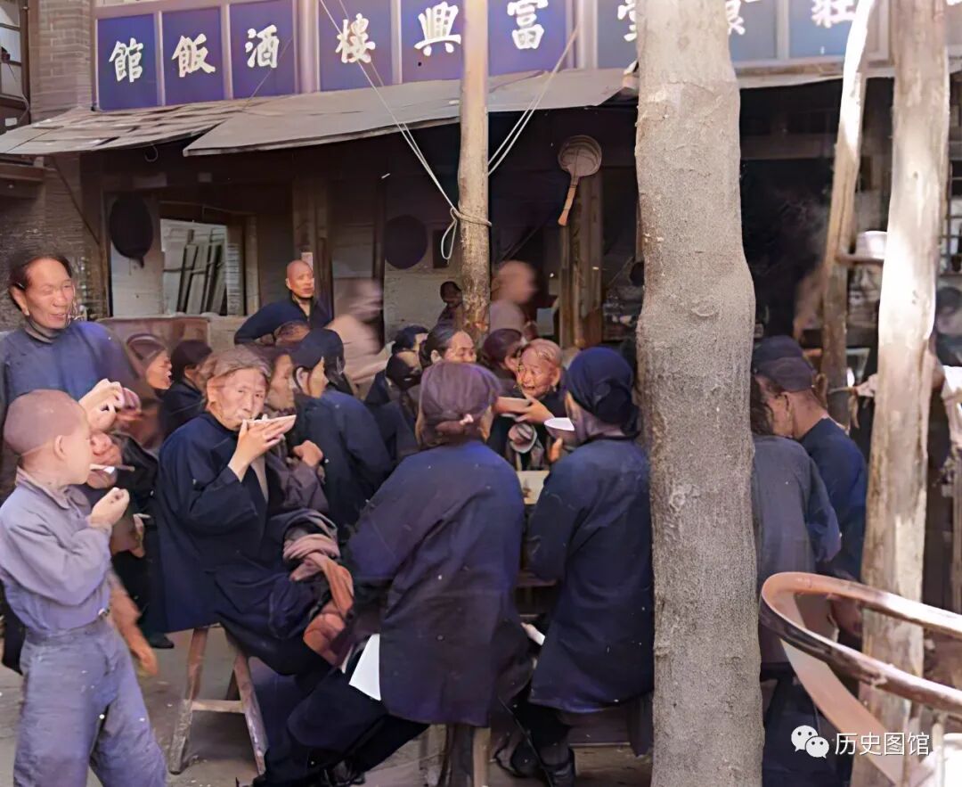 民国时期,在一家名为“福兴楼酒饭馆”门口,一群妇女围坐在一张桌子前,兴高采烈地吃饭。门口坐满了人,可能是正在举行一场结婚喜宴。