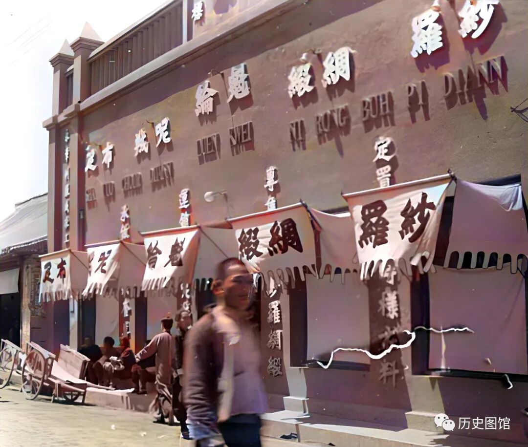 这是当时安阳的一个布匹批发市场。在商场的外墙上,贴着沙罗、绸缎、布匹、定制等字样,下面还标注了英文。店铺门口,悬挂着遮阳棚。