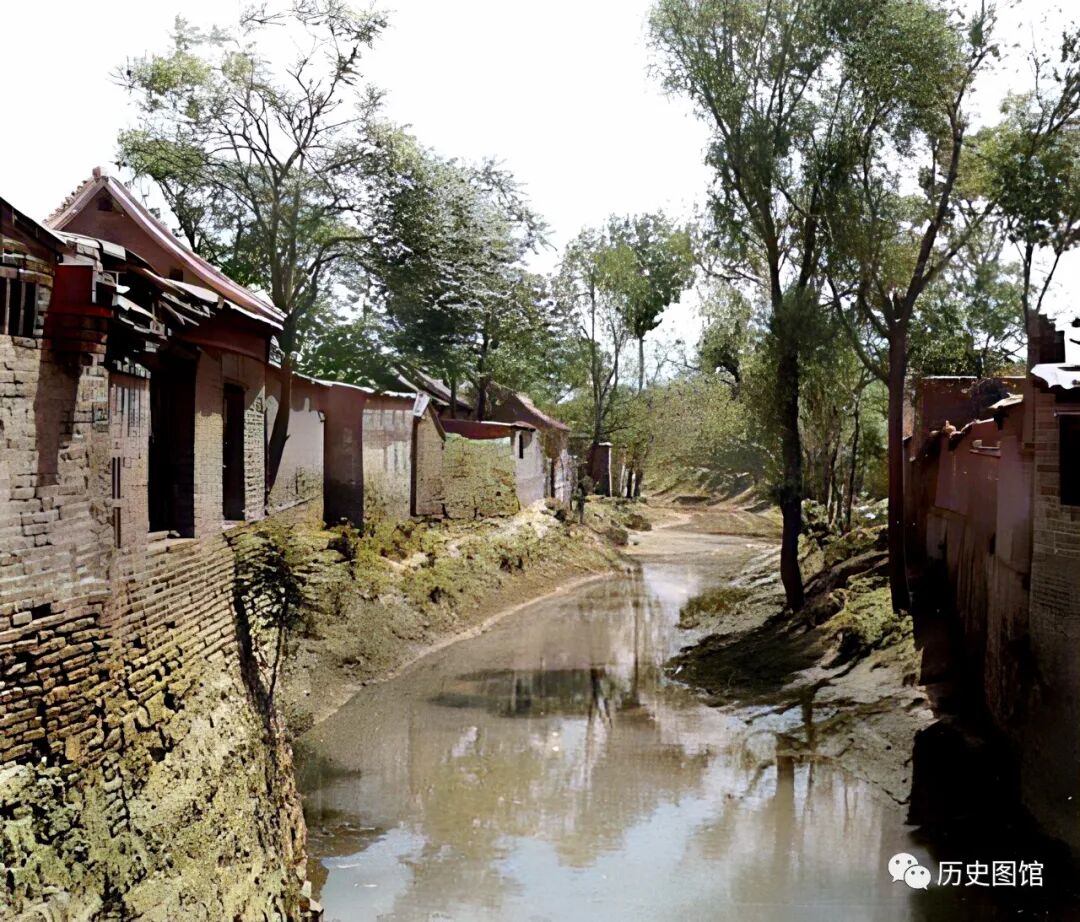 这是安阳城外的一条小河,两侧修建有民居。岸边生长着很多绿树和植被。河道曲折,河水静静地流淌向远方。照片拍摄于1938年。
