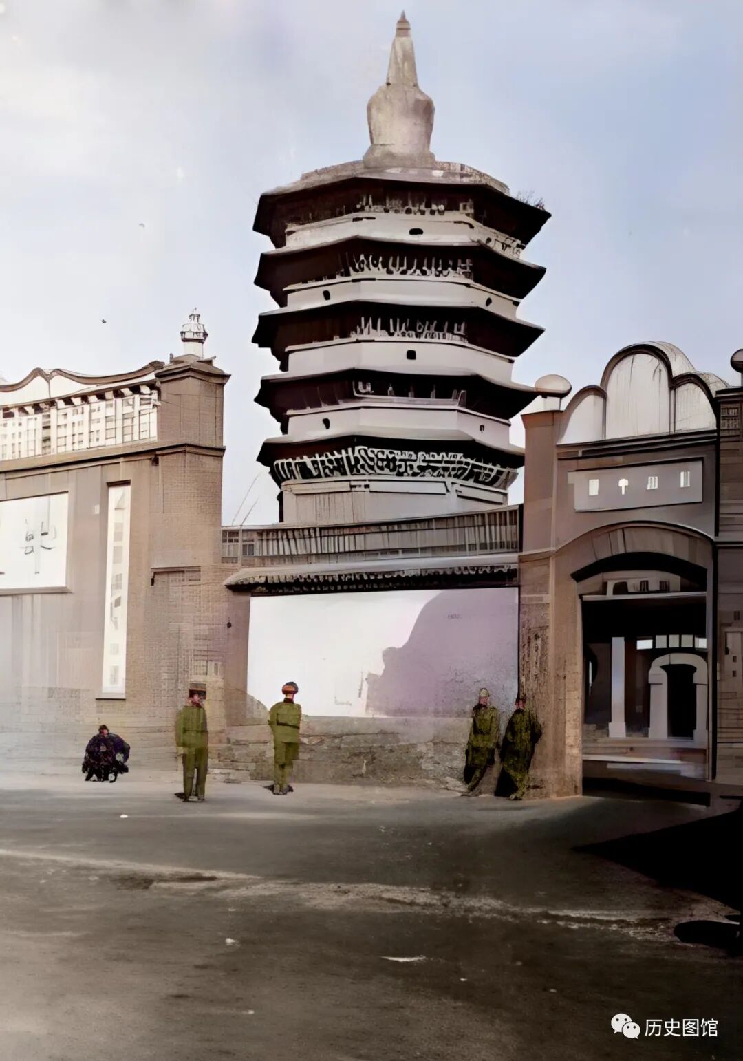 这是安阳的地标性建筑天宁寺塔,也叫文峰塔。该塔始建于后周广顺二年(952年),后世历经多次重修。该塔横额上四个大字"文峰耸秀"。文峰塔下,站着几名日本士兵。