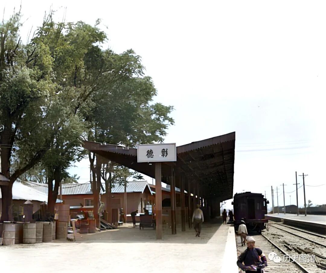 这是民国时期的彰德火车站。长长的站台上方,悬挂着“彰德”的站牌。一列火车停靠在站台上,有乘客正在上下火车。照片拍摄于1940年。