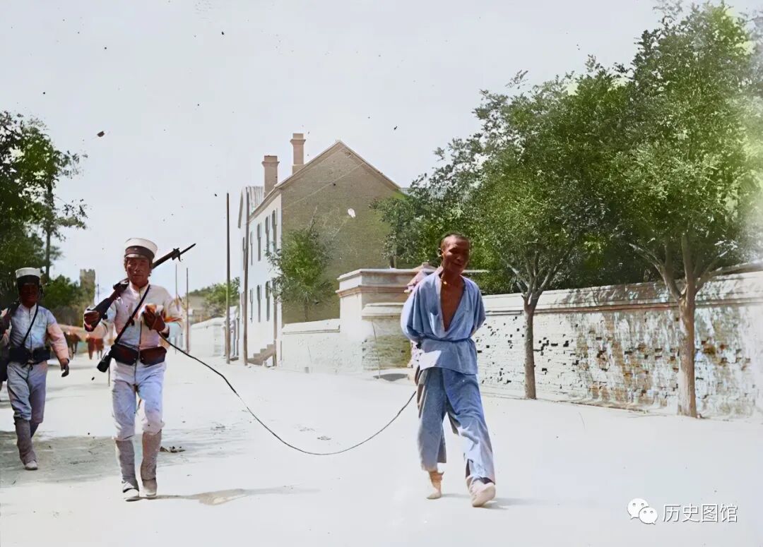 天津街头,两名日军士兵抓住一名清军俘虏。日军将他的手绑在身后,并用一根绳子牵着他前往日军大营。一名日军露出猥琐的笑容,而这名清军俘虏毫不畏惧、视死如归。