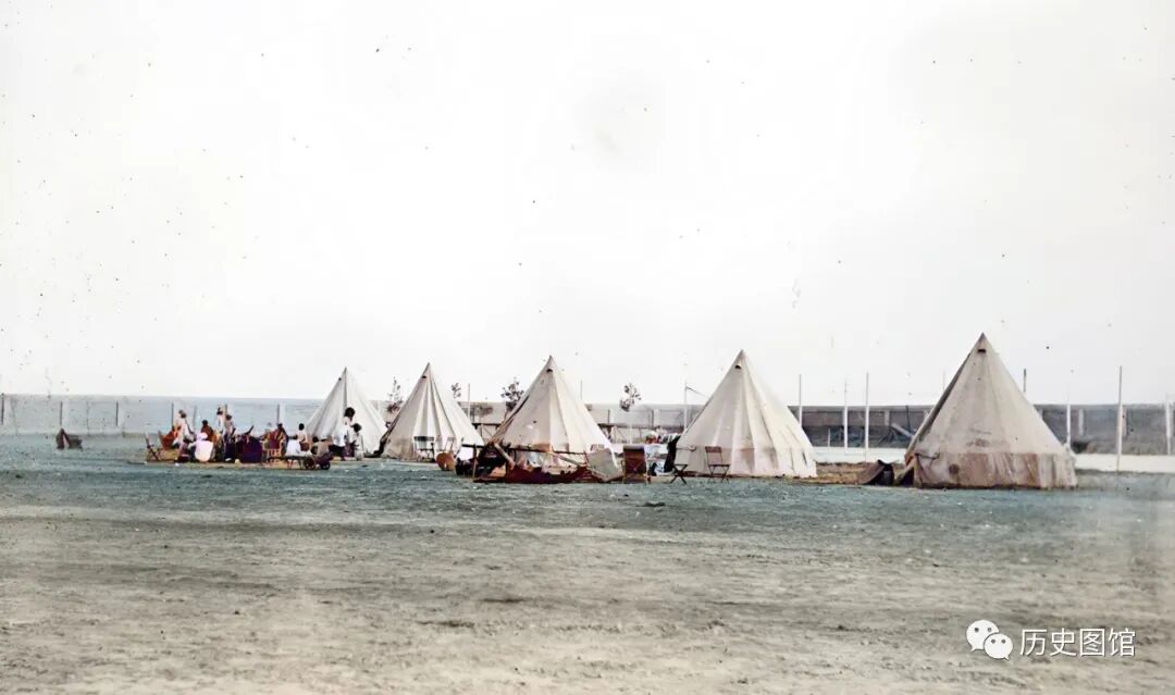 照片中,在宽阔的广场上,几座尖顶帐篷十分显眼。一些英军士兵聚集在一起讨论作战方案。