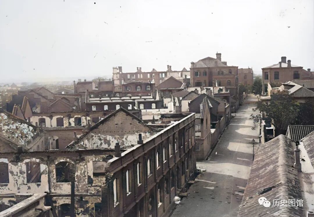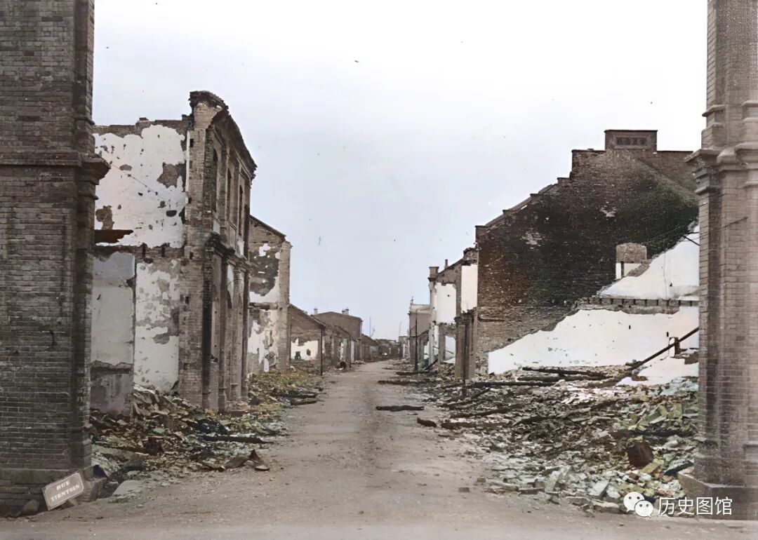 1900年,八国联军占领天津。法国租界天津街上的情景。昔日繁华的街道,变成了一片瓦砾,到处是断壁残垣。连一个人也看不到。房屋墙壁被大火熏得漆黑。