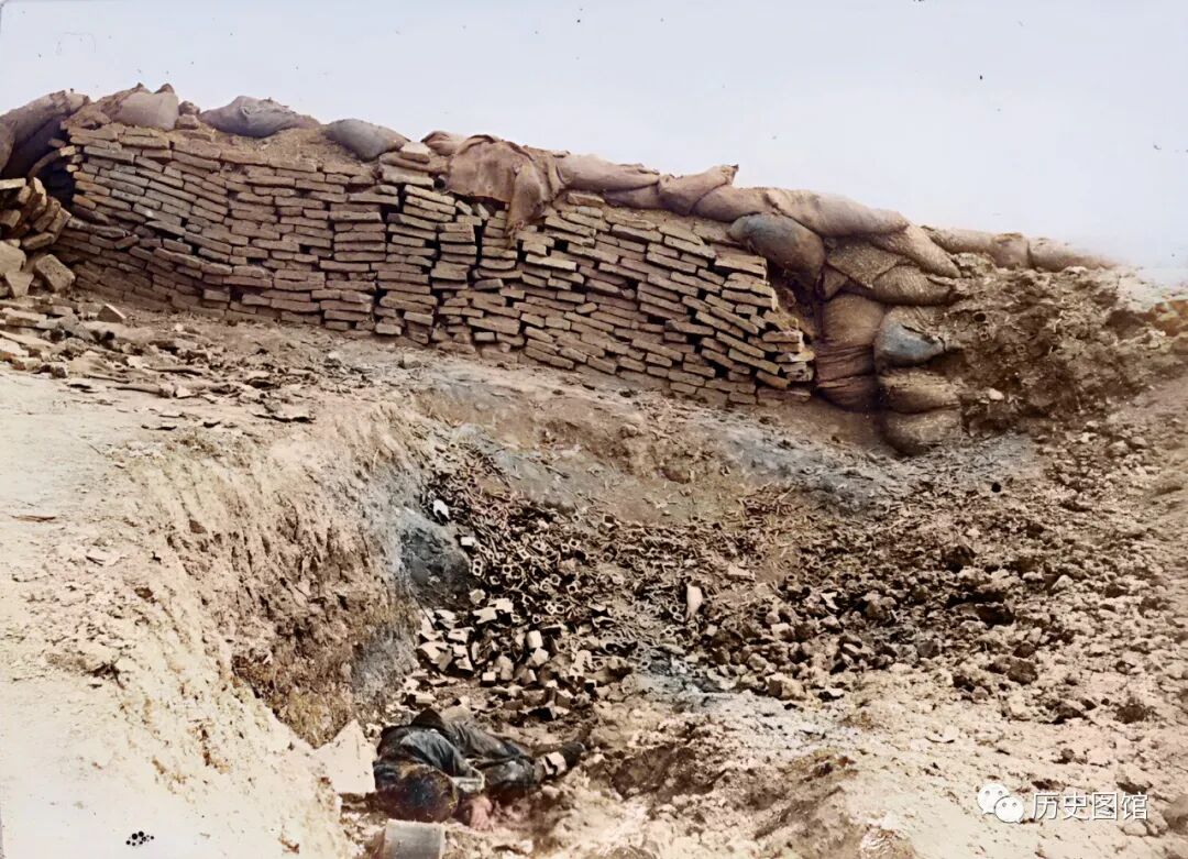 1900年,八国联军占领清军一个军事据点后,拍下这张照片。掩体是用砖头和沙袋垒砌而成。一段掩体被炸塌,砖头散落在地上。战壕里,散落着很多空弹夹,还有一名阵亡的清军士兵。可以想象,当时战斗的激烈程度。
