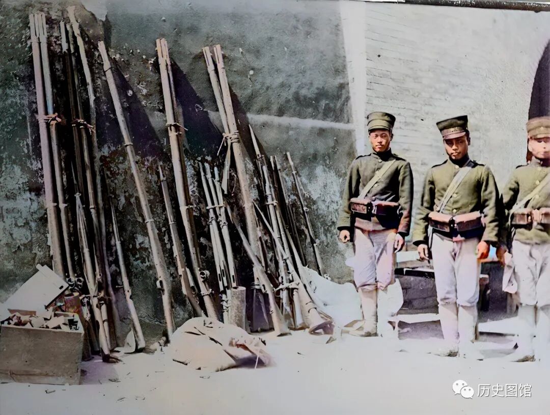 1900年,八国联军占领天津后。日军士兵在天津一座防御碉堡发现义和团使用的武器。