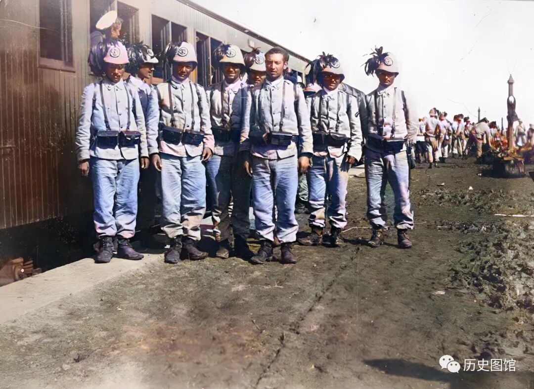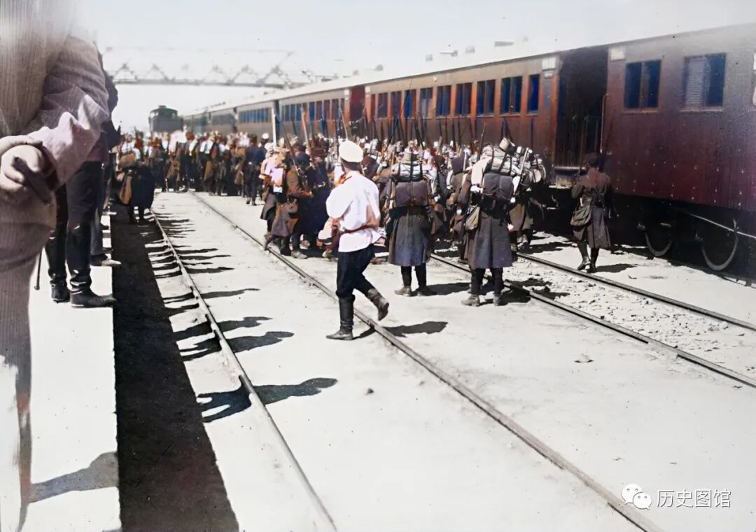 1900年,天津火车站上,一群意大利士兵正准备登上火车。他们穿着奇特的军装,戴着有羽毛的帽子。八国联军里,意大利派出的陆军士兵只有5人,海军士兵80人,战舰2艘。