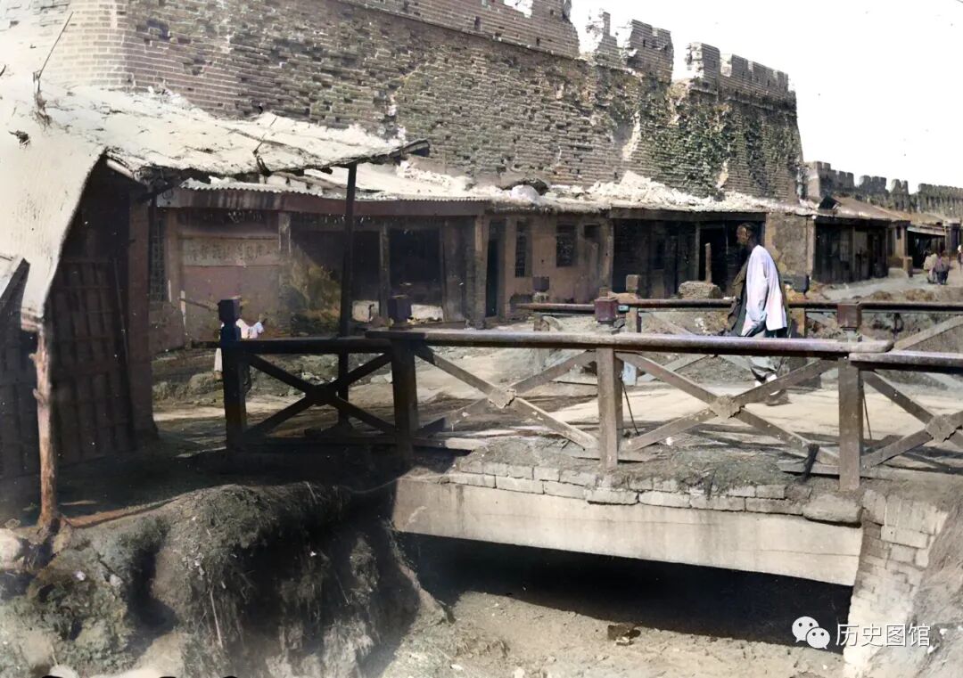 城墙根的一排店铺,也是人去楼空。一名男子从城墙前面的一座小桥上走过,扑面而来的是满目的凄凉。