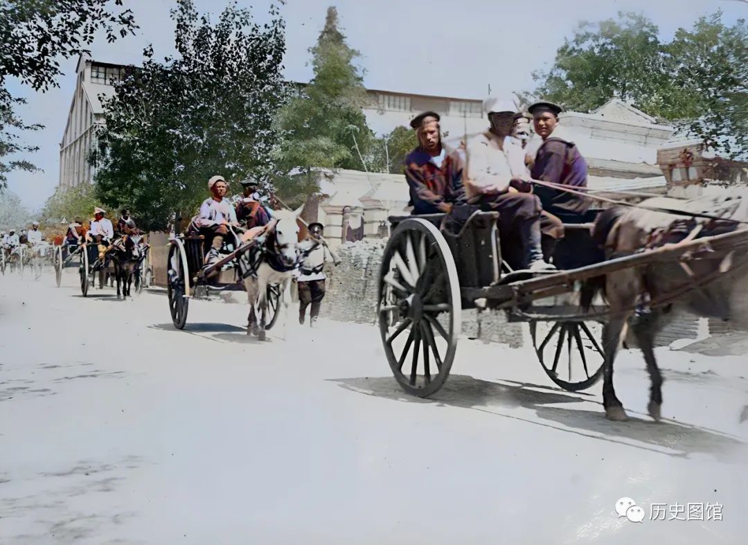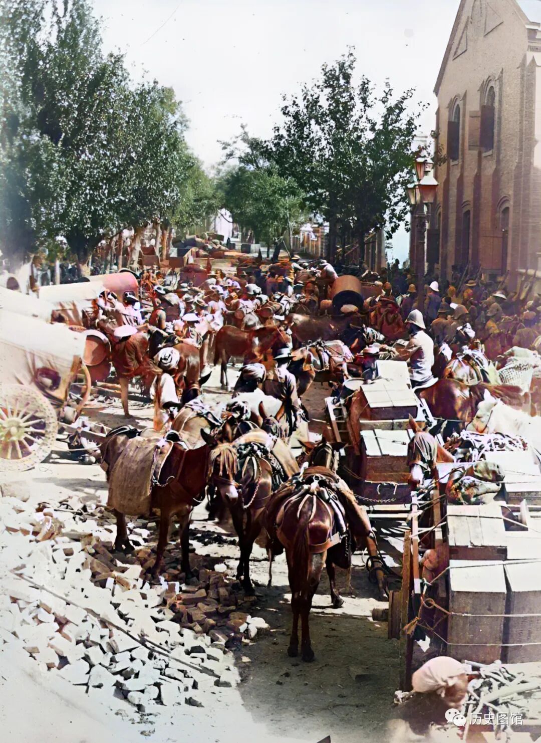 1900年,八国联军攻占天津后,继续向北京进犯。这是八国联军的辎重车队,正准备开往北京。为了装载更多的物资,八国联军征用老百姓各种车辆,一辆辆马车上装满了各种物资。
