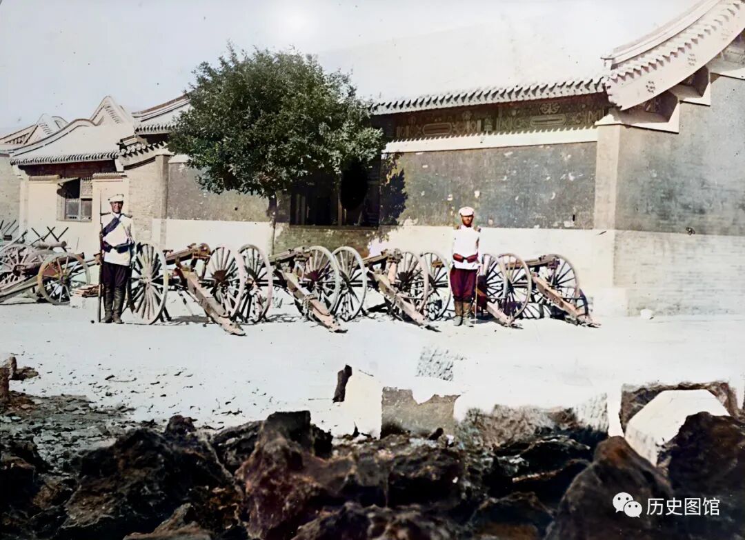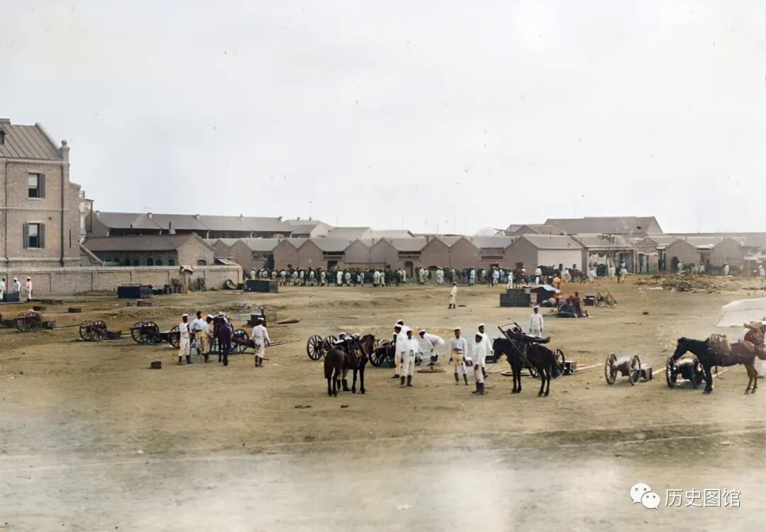 八国联军攻占天津后,日军炮兵部队在一处广场上休整。广场上摆放着十几门大炮和大量弹药。远处,是日军的一支骑兵部队。
