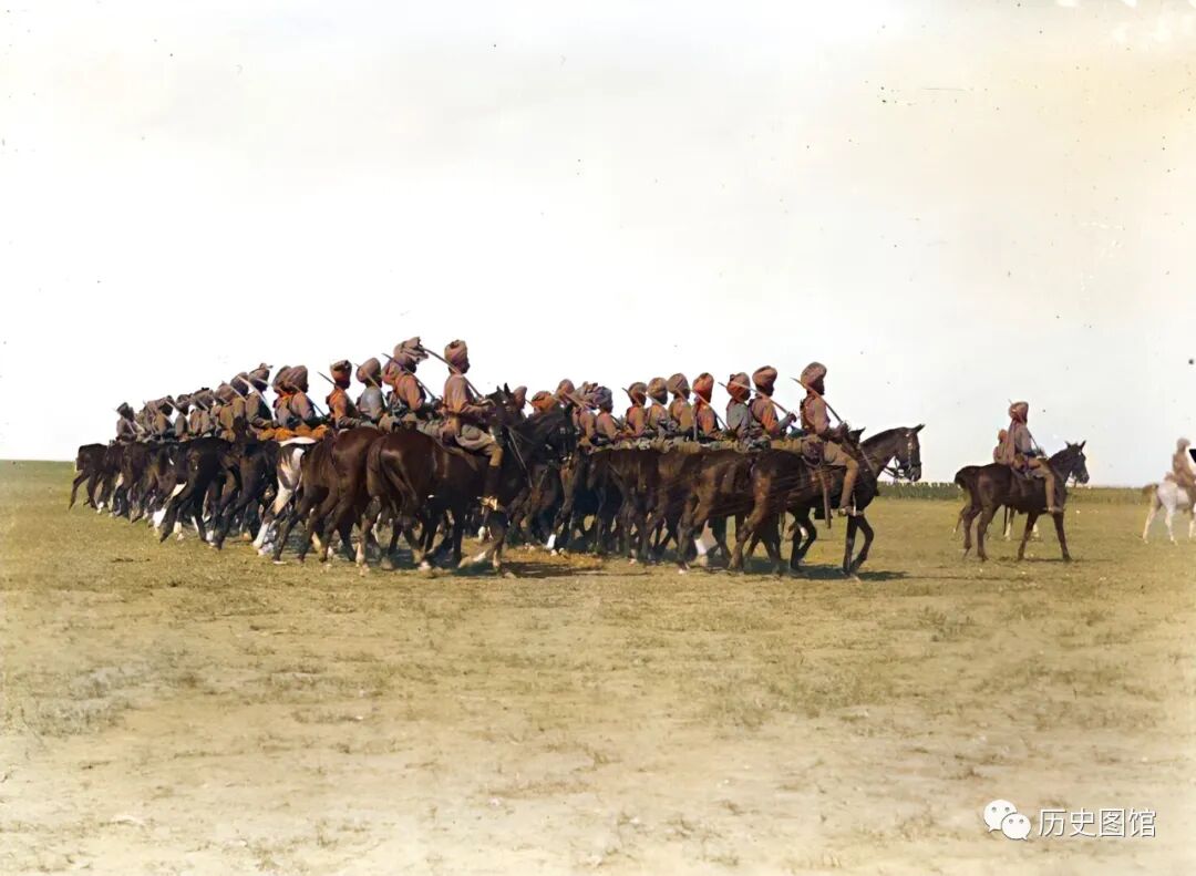 照片中这群戴着头巾、手握马刀的外国士兵,是一支骑兵队伍,他们来自印度孟买的游骑兵。印度当时还是英国的殖民地,当时跟随八国联军攻打天津的英国军队当中,有很大一部分是印度人。照片里的他们耀武扬威。