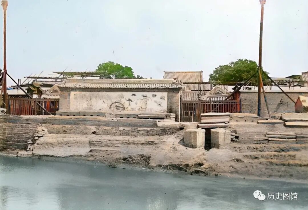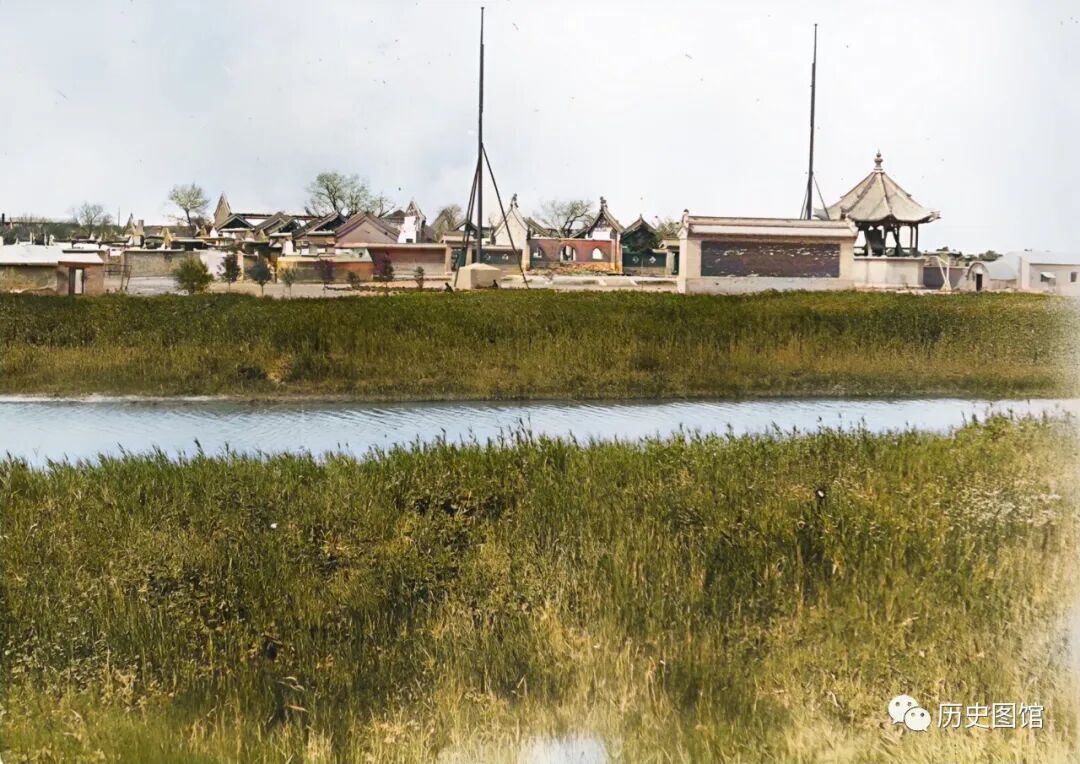 照片里的总督府规模不小,门前有木制的栅栏。前面还有一座照壁,照壁下面是一条河。