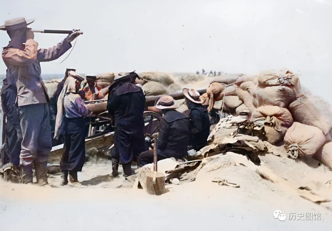 这是位于天津城外英军的一处炮兵阵地。他们用沙袋做掩体,炮口正对着天津城。一名军官模样的人,正举着望远镜,朝天津城窥视。英军使用的是后膛炮,在当时是最先进的。