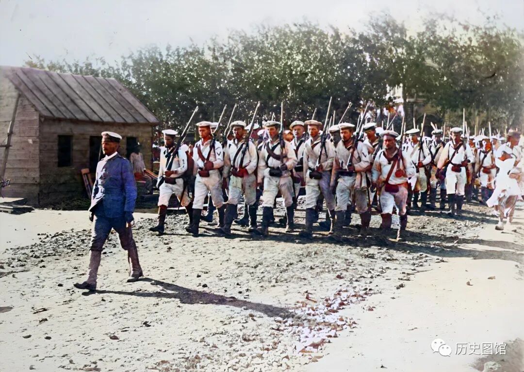 八国联军占领天津后,奥地利海军陆战队士兵排着队从街道上走过,走在前面的是一名军官。据史料记载,当时参加八国联军的奥地利士兵只有58人。