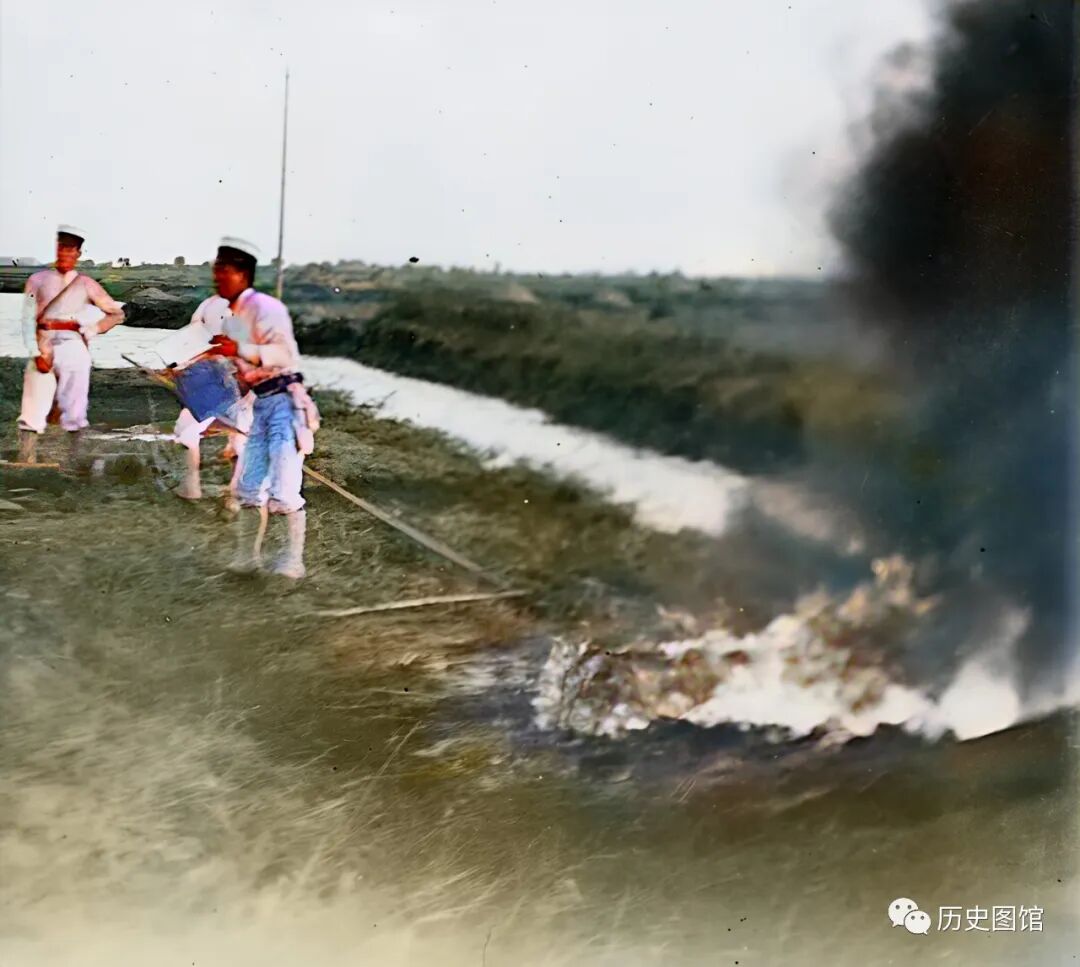 1900年7月13日,八国联军攻打天津时,有日军少佐在内的多名军官被清军击毙,普通士兵伤亡也不在少数。照片中三名日军正在河边焚烧火化日军尸体,然后取走遗骨带回国内。