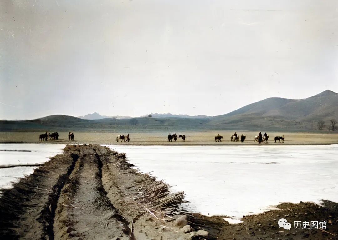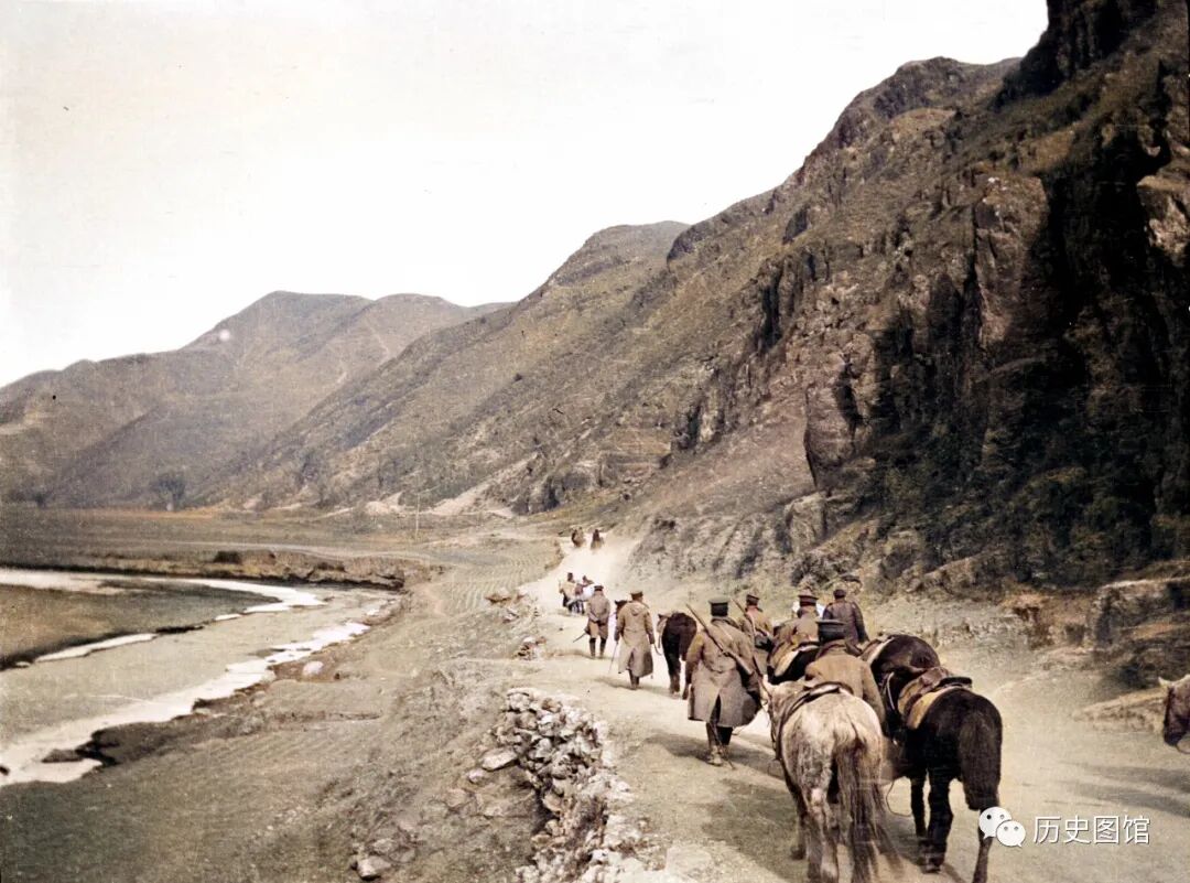 照片中能看到士兵们穿着大衣背着枪,都在牵着马而行。路旁的河岸上,有当地百姓开垦的庄稼地。旁边的山上光秃秃的,基本上看不到任何树木和植被。