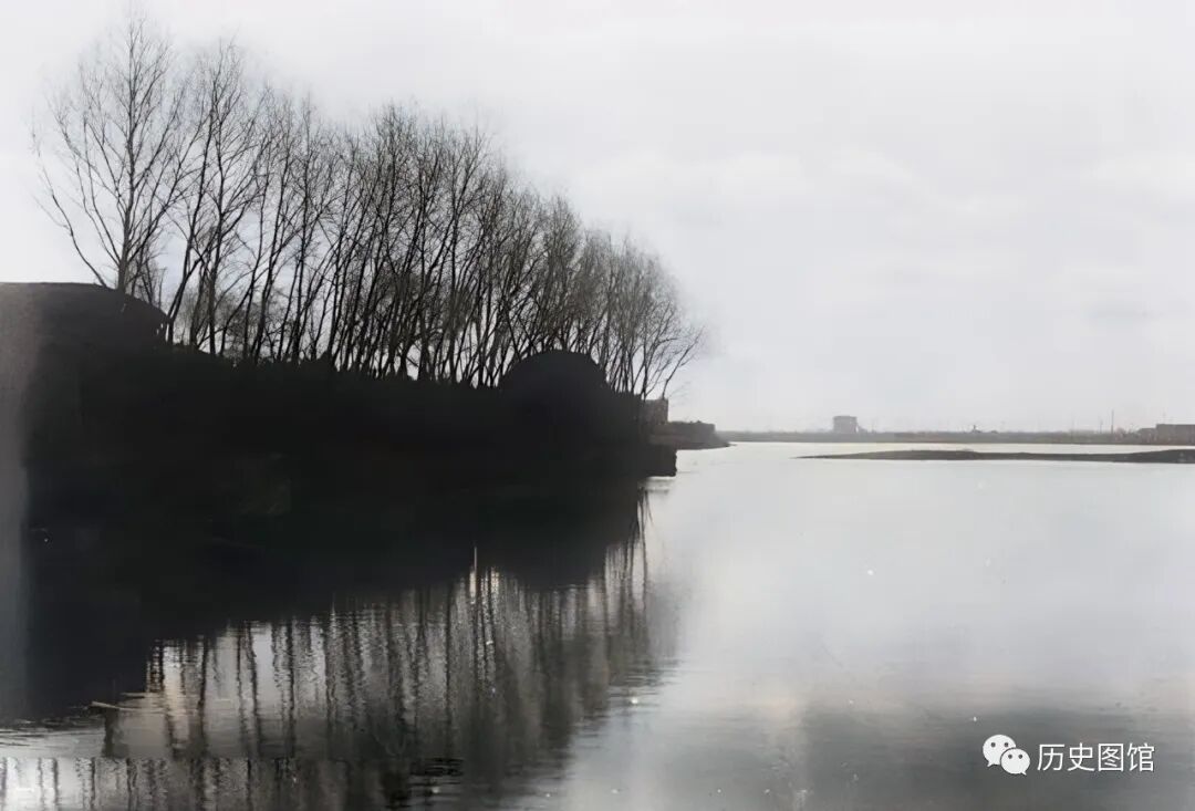 这是位于六股河上的一座临时土桥。当时,河边已经结冰,人们为了到达河对面,在冰上堆放秸秆,再在上面铺上土,行人和马车就能到达河对岸了。照片拍摄于1930年。
