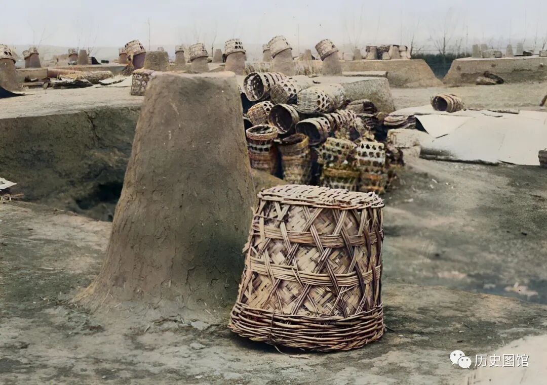 在这些仓库的上面,都建有一个类似烟囱的泥柱子,应该是通风用的,上面还罩着竹筐。照片拍摄于1935年。现在的葫芦岛,还能看到这样的地下仓库吗?