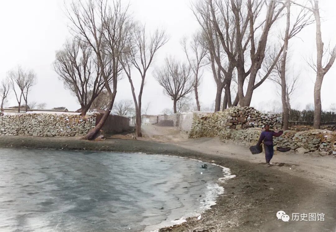 30年代,连山风光。这是连山当地的一个村落,有石头垒砌的院墙。村边有一个池塘,天气寒冷,池塘里的水结冰了。一名男子挑着担子,从池塘边走过。
