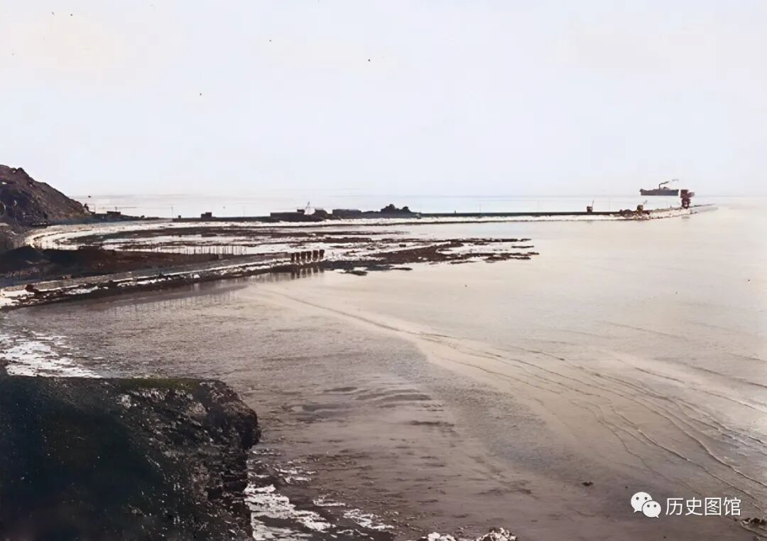 30年代,辽宁葫芦岛长长的防波堤。弧线形的防波堤伸入海水中,阻断波浪的冲击力、围护港池,为港湾里的船只阻挡风浪。