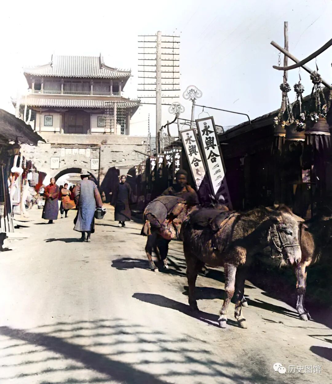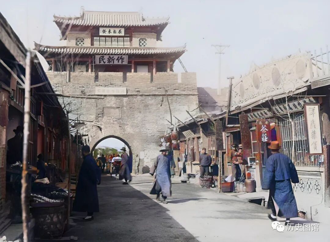 城门楼高大壮观,城门前是一条繁华热闹的大街,行人来往如织。街道两侧都是商铺,街边“永兴合”的广告牌子十分醒目。明代古城的建筑至今仍存。