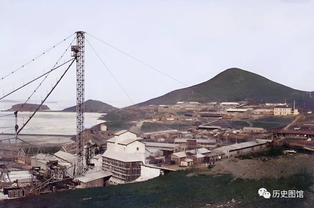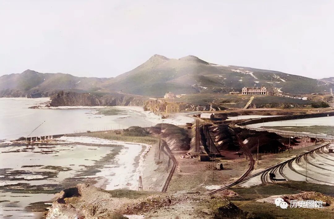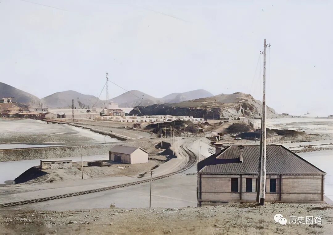 30年代,辽宁葫芦岛港口全貌。港口上一条条铁轨,还有堆积如山的煤炭。此时的葫芦岛,已被日本人占领。正对面的建筑是港口事务所。照片拍摄于1935年。