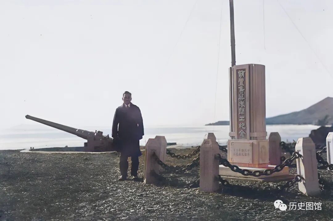 照片中,石碑四周建有石头围栏。站在石碑旁的是一名日本人。在他身后,能看到一门巨炮,炮口指向大海。