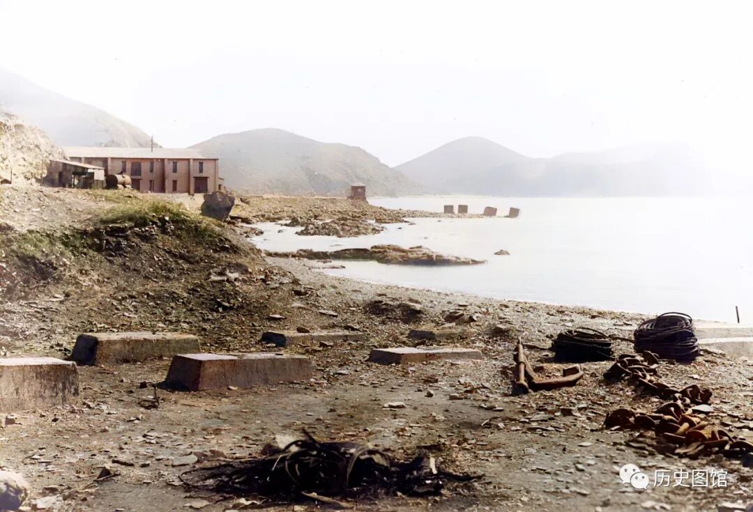 照片中是战火之后造成的废墟,地上丢弃着一些铁链和水泥桩。海岸上有一座两层的楼房,远处青山连绵不绝。照片拍摄于1935年。