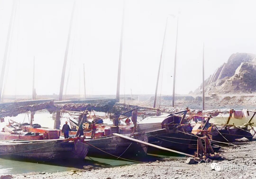 这是位于葫芦岛的一个小港湾,岸边停泊着几艘大型帆船。船上有几名船夫,他们正在为扬帆远航做准备。照片拍摄于1935年。