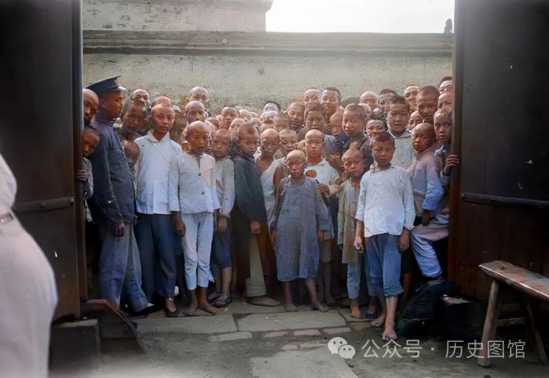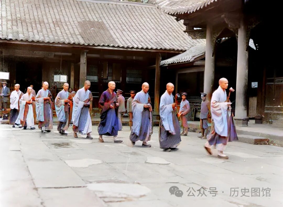 1917年,成都文殊院的和尚们,正列队准备进入大殿举行法事。几名身穿制服的卫兵在院里安保。在大殿前,有一名戴礼帽的外国人,想必是甘博率领的考察队成员之一。