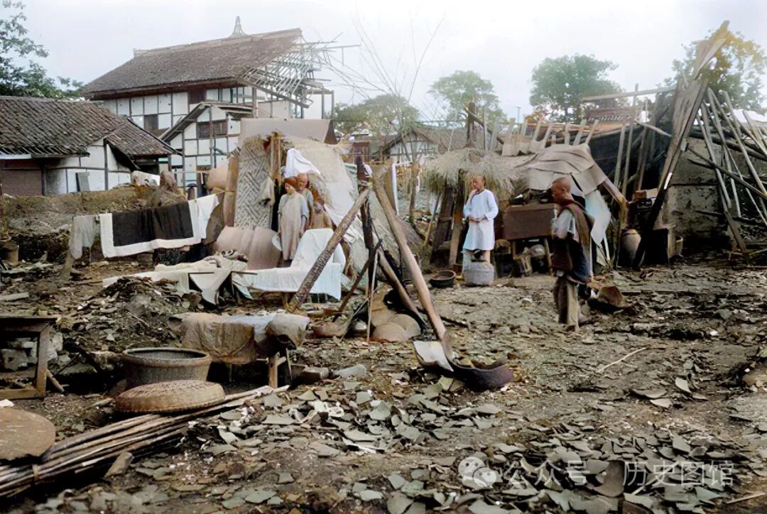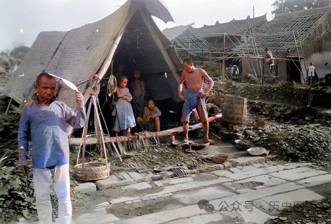在成都的一个角落,甘博看到了一户无家可归的人家,他们的房屋被毁坏,就在路边临时搭起一个窝棚,一家人都挤在里面,真是太不容易了。
