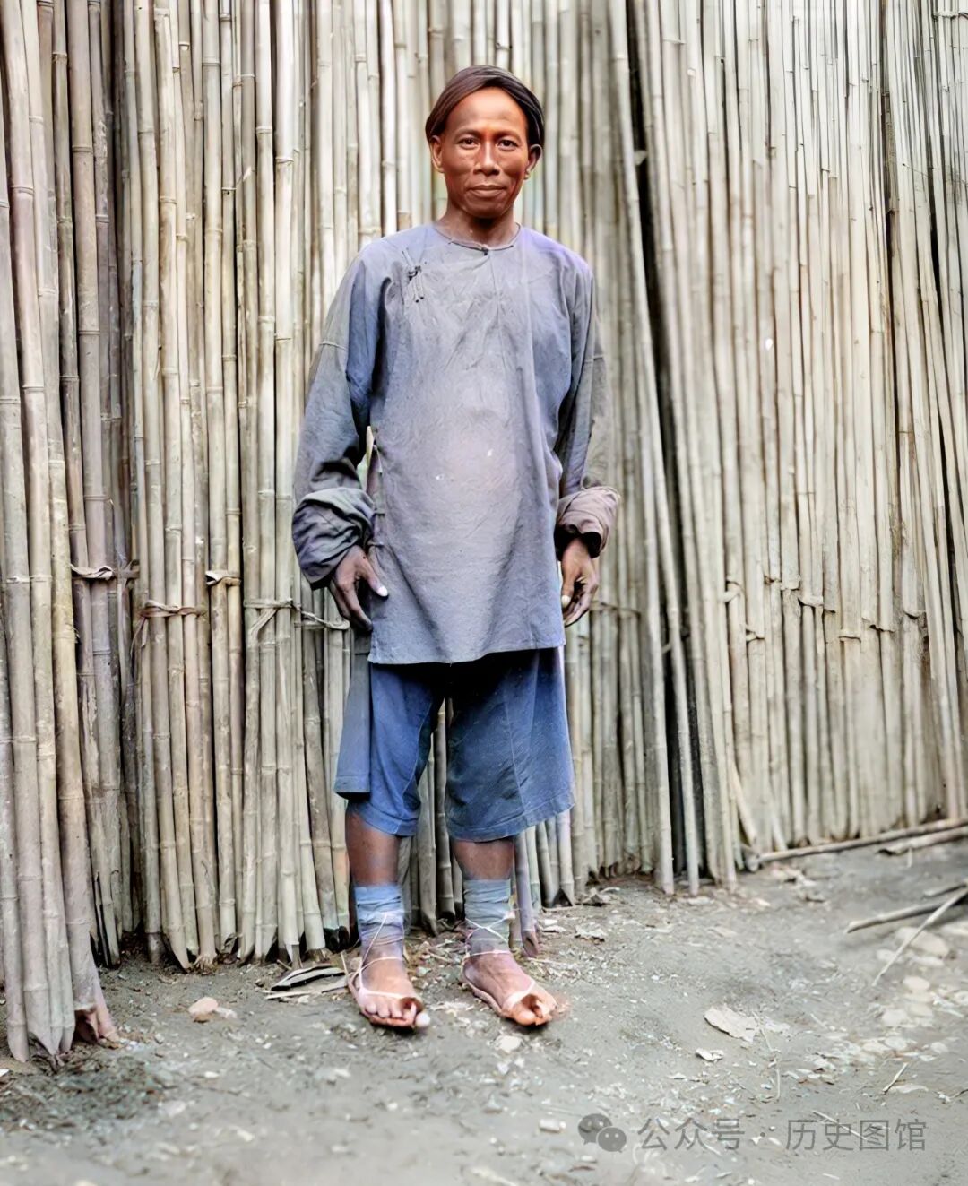 1917,甘博在成都郊区考察时,在市场上遇到了一名当地人。他是一名卖竹子的小贩,站在成捆的竹竿前,甘博为他拍下了这张照片。
