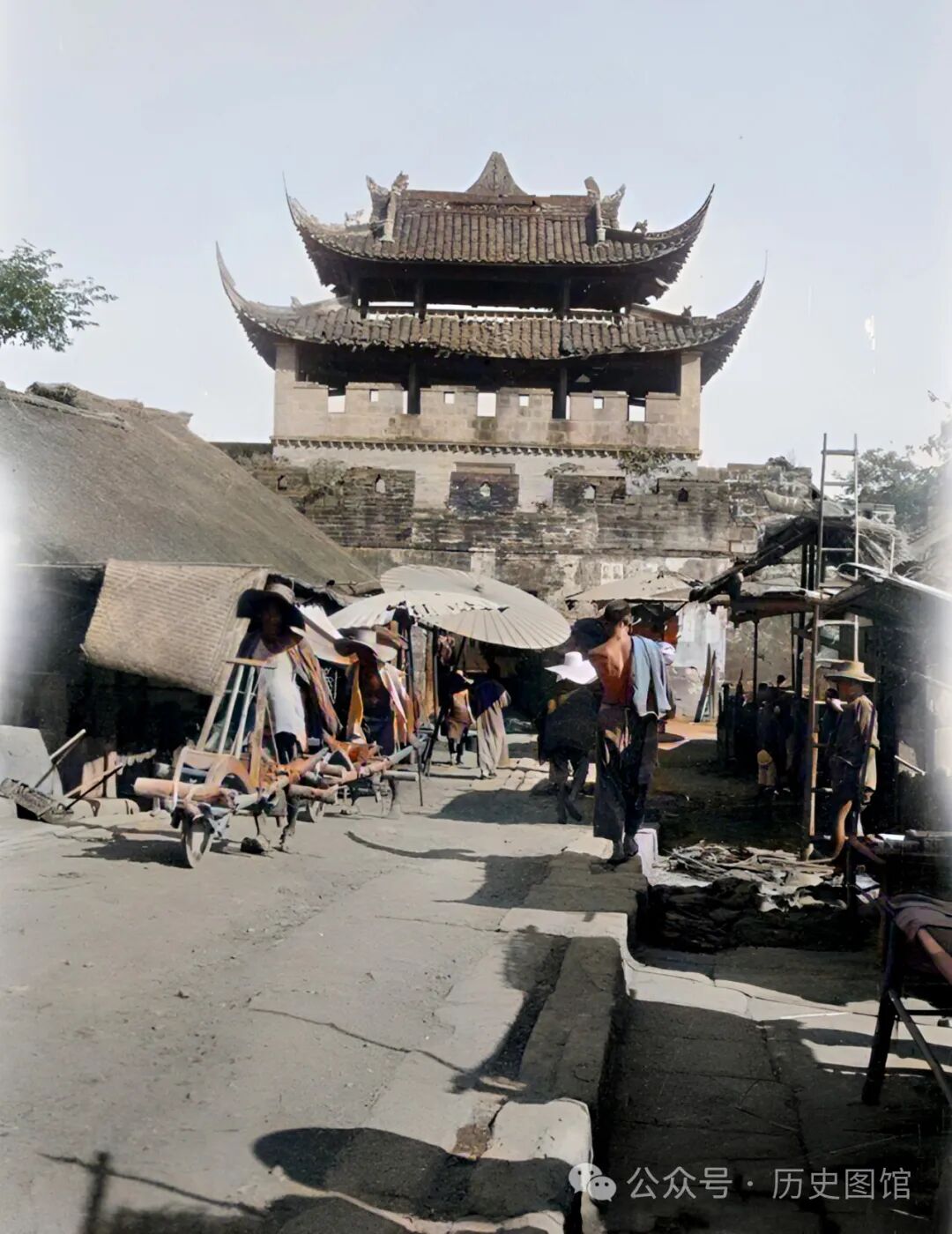 这张照片,拍摄的是郫县城门。城门高大雄伟,飞檐高挑,很是壮观。城门前是一条热闹的小街,两侧是沿街店铺,几名推独轮车的男子从街上走过。