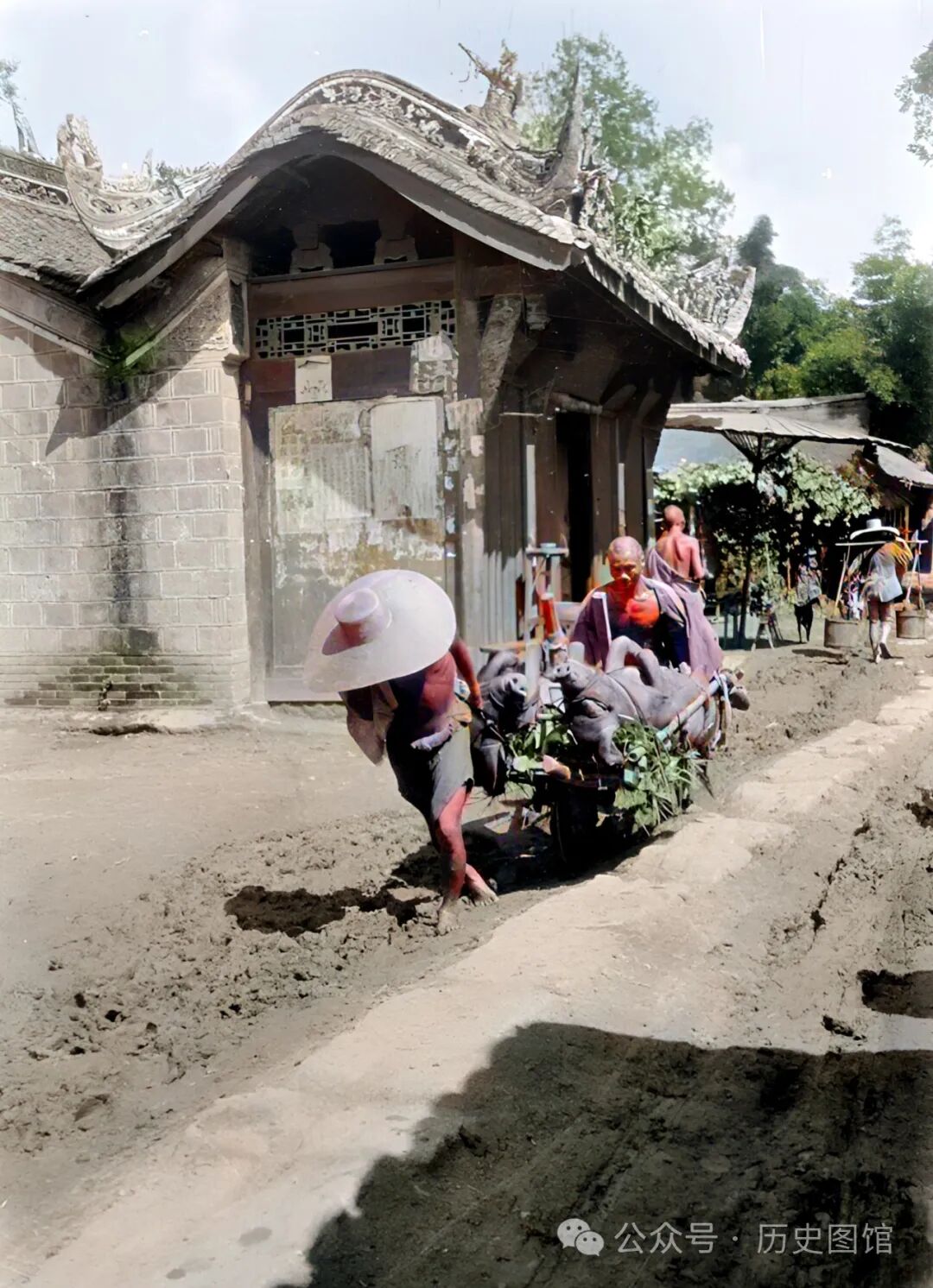 1917年,成都的一条小街上,两名男子正推着独轮车赶路,车上并排放着两头猪。一人在后面推车,另一人在前面用绳子拉车。背景建筑像是一座寺庙的山门。