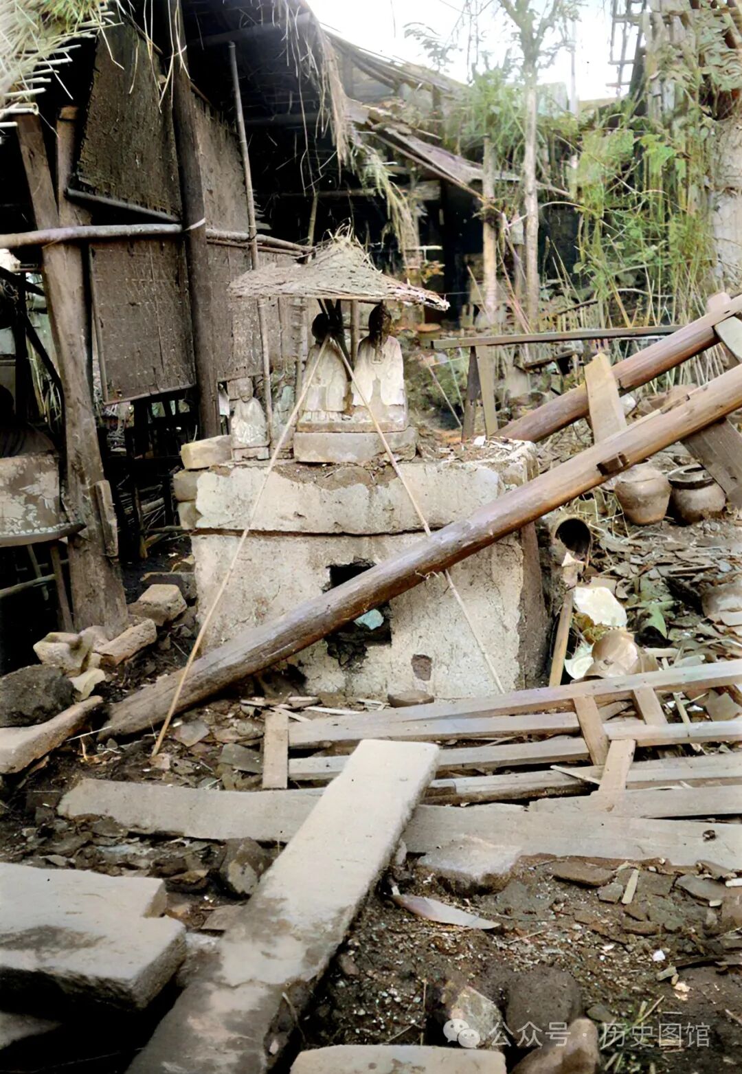 甘博在成都一处被损毁的房屋前,看到了一个小土台。台子上放着几个小神像,看上去像是土地庙。