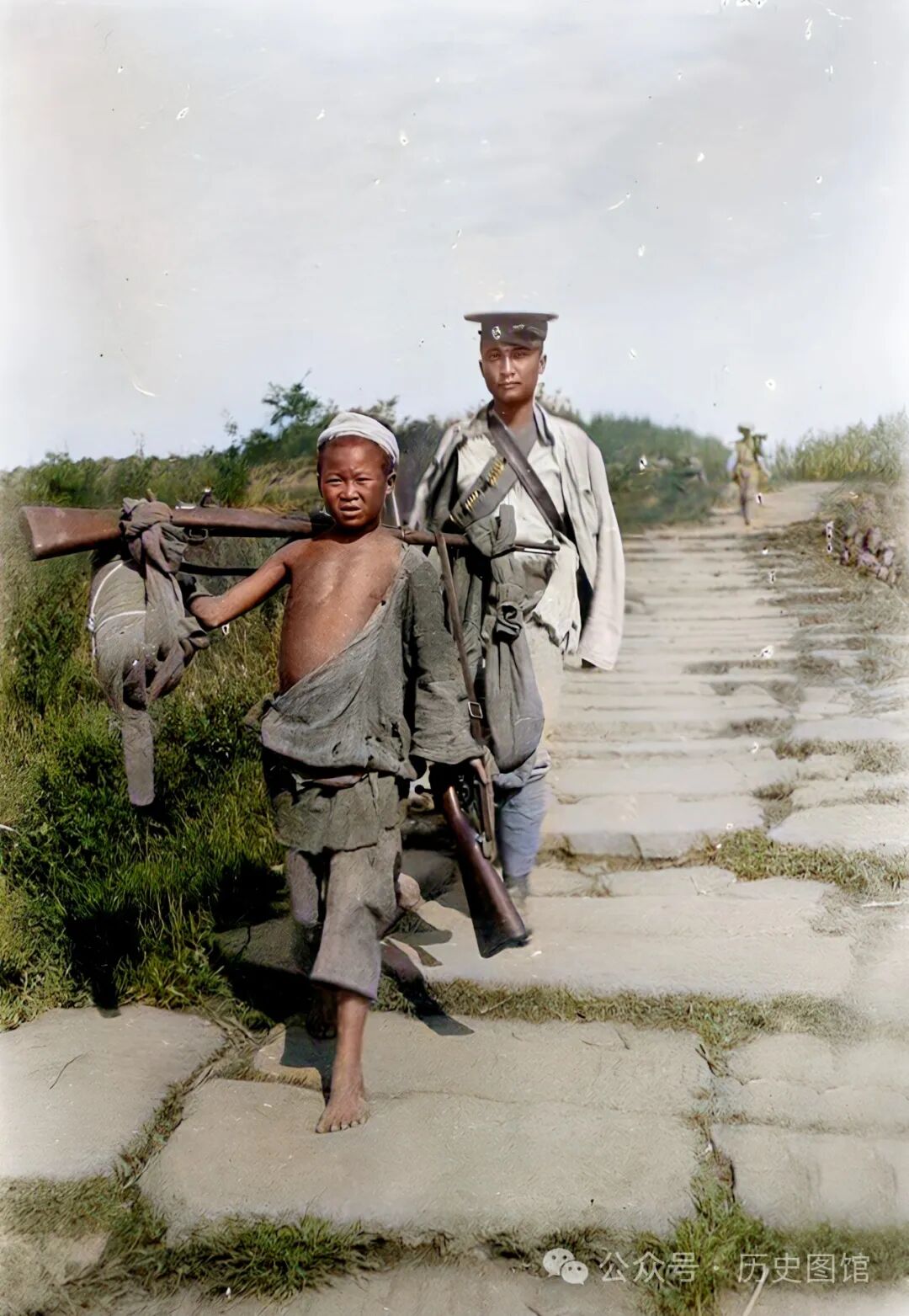 照片中这名男孩,皮肤晒得黝黑。可能是这名士兵雇佣了男孩,也有可能是强迫这名男孩为他带路。在他们身后不远处,还有一名士兵走下山来。
